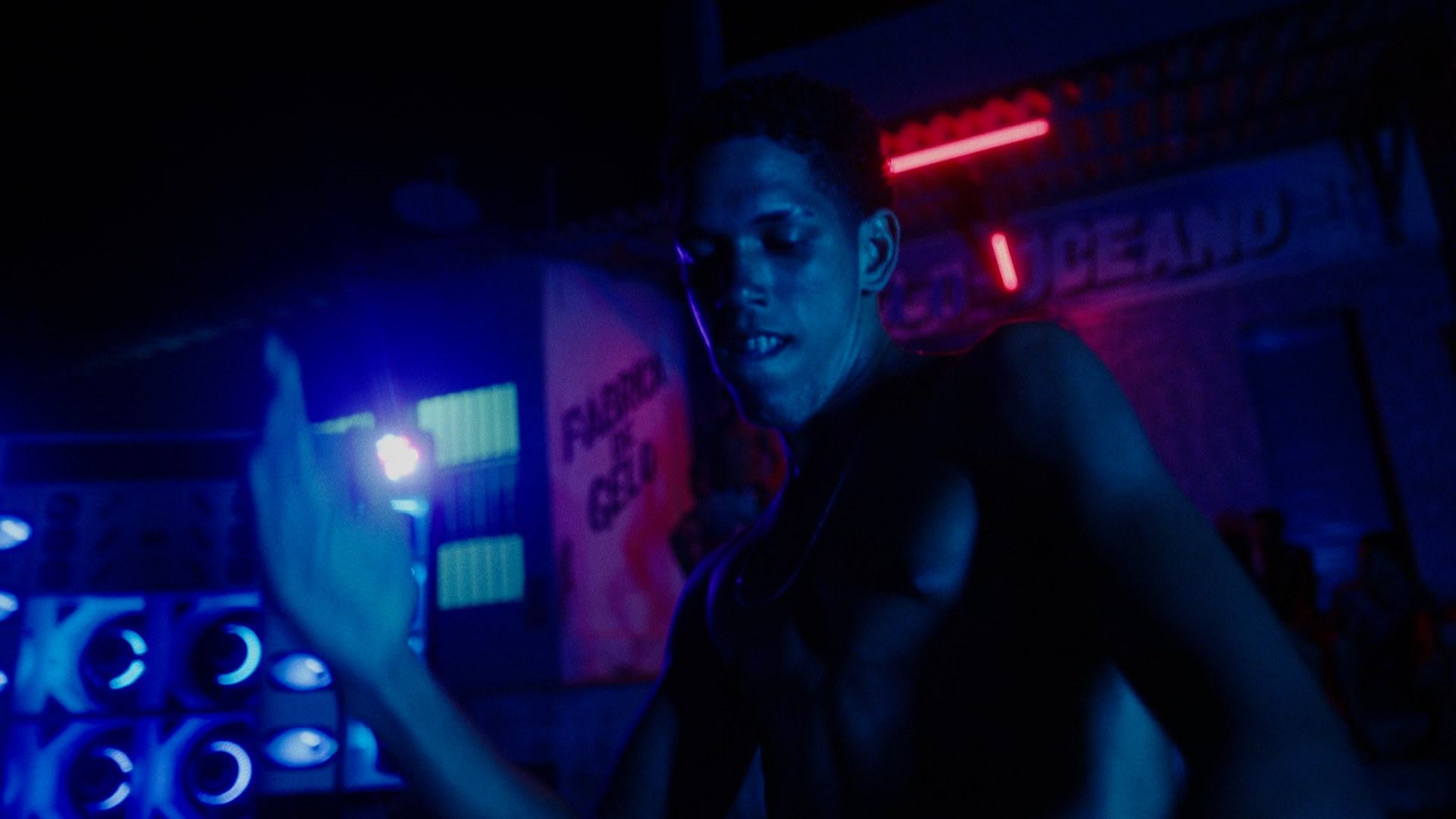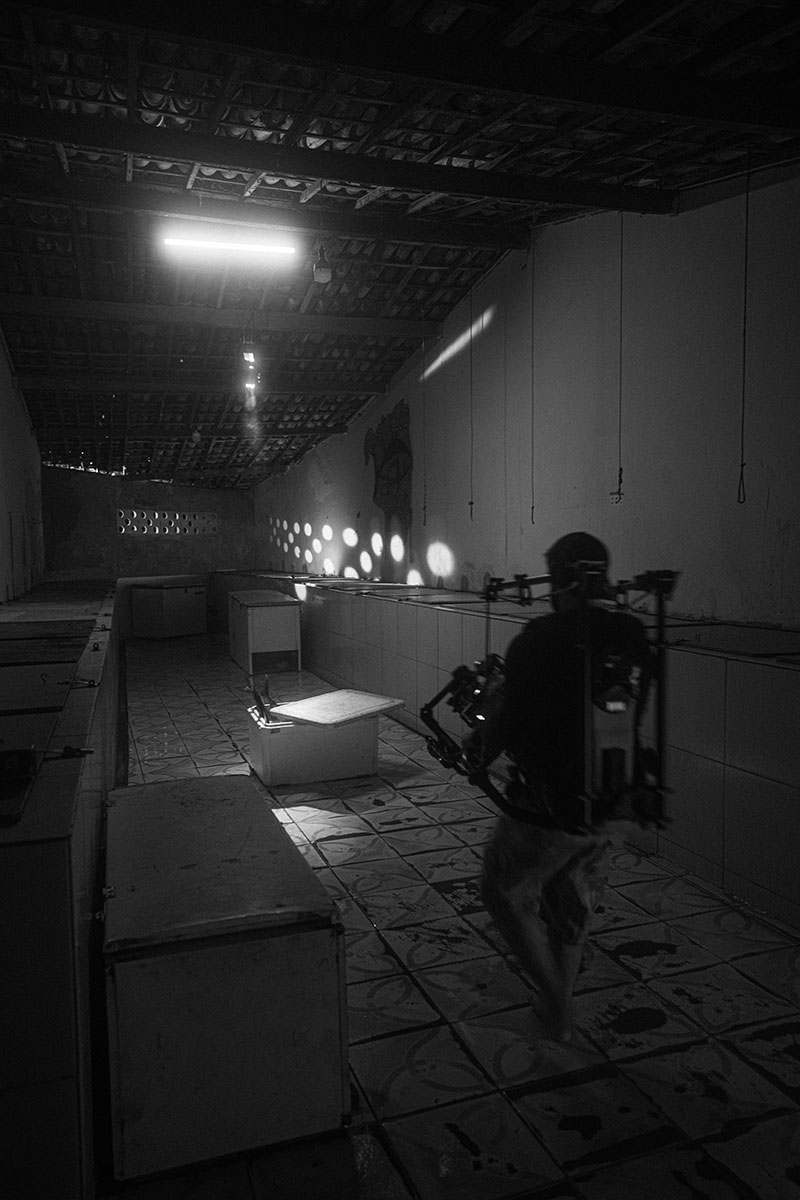 Levei poucos equipamentos de luz e trabalhei com o Cristiano, gaffer local. A cena do início do filme, da caixa de isopor, é a mais elaborada nesse sentido. Na locação já existia uma lâmpada que atravessava o cobogó e formava círculos na parede. Isso me deu a ideia de somente reforçar o desenho da luz com um refletor tungstênio de 1000 watts filtrado com CTB. No teto sobre a caixa de isopor, penduramos um Fresnel de 650w e mais uma Astera, com temperatura fria um pouco ciano. Acrescentei também uma outra luz com cor vermelha como luz de preenchimento. A locação é o corredor de uma peixaria municipal à beira-mar. Deu trabalho para montar tudo devido ao tamanho da equipe. Não levei HMI, apenas um kit de Asteras e tungstênio.