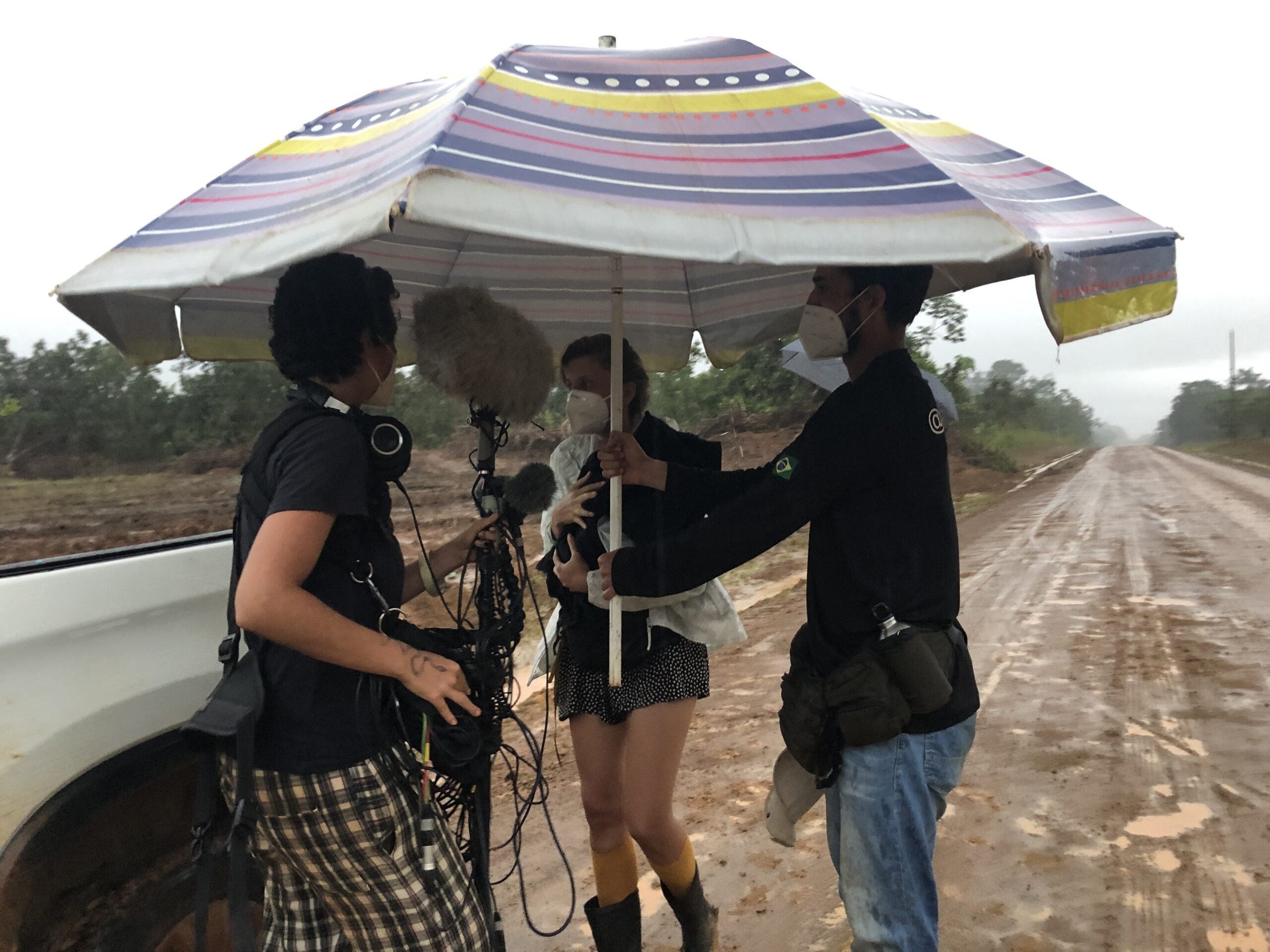 Filmamos em fevereiro de 2021, no auge da pandemia, logo após um período mais rígido de lockdown. Havia outra diretora de fotografia na equipe, mas precisamos substituir de última hora porque ela testou positivo para covid. Carine entrou no projeto um dia antes da nossa viagem, 12 horas antes de embarcar. Os equipamentos já estavam definidos, mas ainda deu tempo de ir à locadora para fazermos testes, aí decidimos trocar a Sony Alpha pela Black Magic porque era mais leve, porque Carine tinha mais familiaridade e por uma questão de profundidade de cor. Nas filmagens, usamos apenas um tripé, três lentes fixas e a câmera. Eu queria que a fotógrafa fosse uma mulher, assim como convidei Marcela Santos para o som, Carolina Gesser como produtora e Yuyan Wang como montadora. Eu mesma fui a motorista. Enquanto Carine fazia o logging de madrugada, eu saía para comprar pizza. Foram 9 dias de viagem e 5 dias de filmagens. Eu sabia exatamente o que eu queria esteticamente e conceitualmente. A dificuldade era fazer acontecer, pois muita coisa pode dar errado na hora de transformar um desenho em realidade. Aquela cena do bar, por exemplo, era durante o dia, mas decidimos fazer à noite porque percebemos que ficaria mais bonito. Vitória Pereira, a atriz que interpreta Iracema, entrou no filme um dia antes de filmarmos. Quando chegamos, o tempo estava nublado. Por sorte, o céu abriu e pudemos trabalhar melhor a cor. A poeira da estrada interferia também nos tons de verde da floresta.