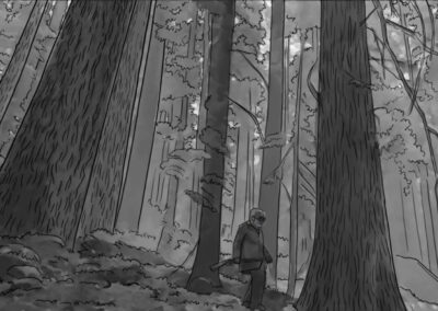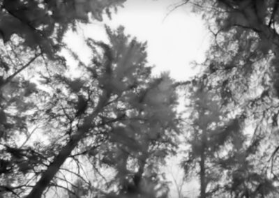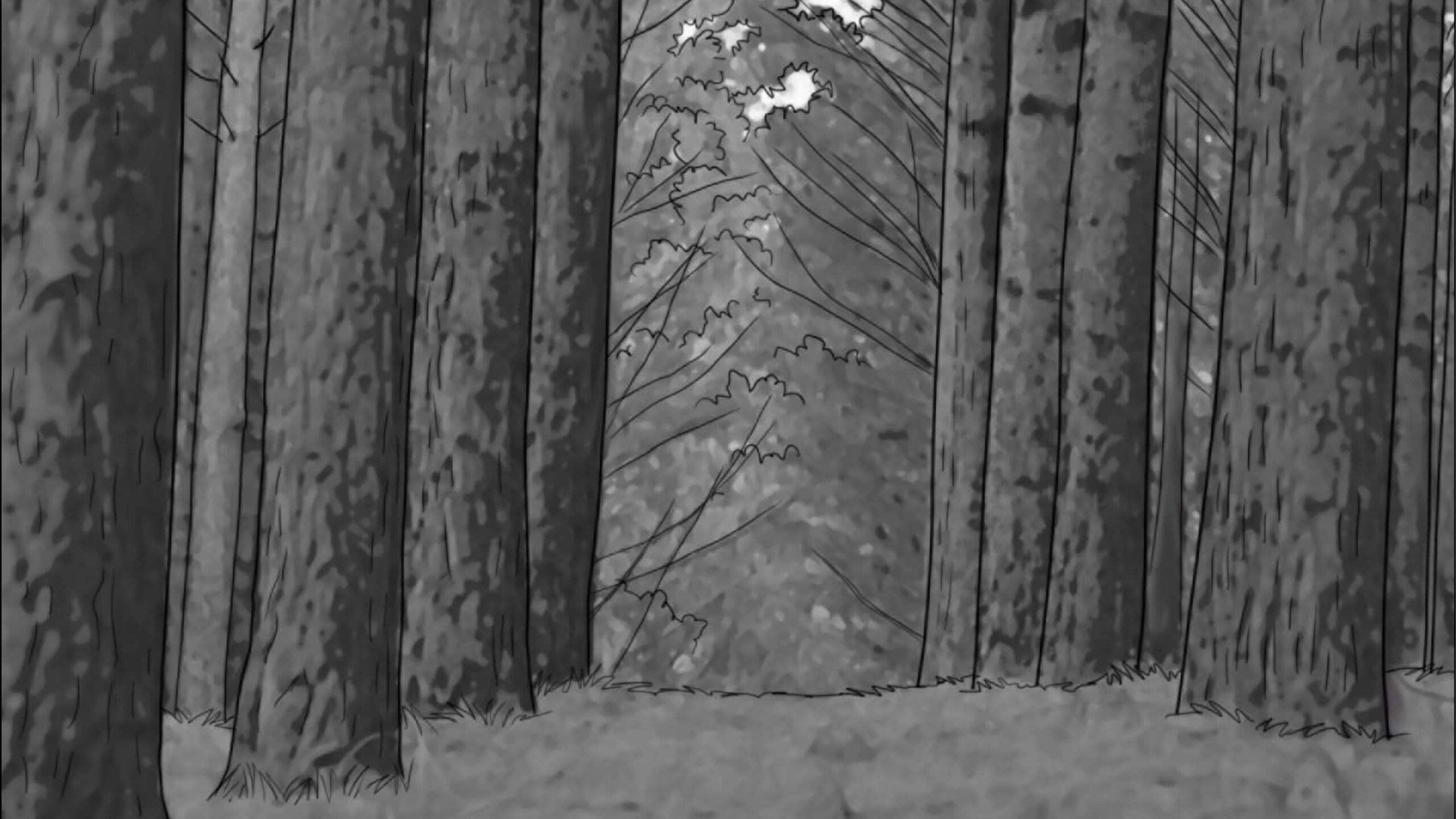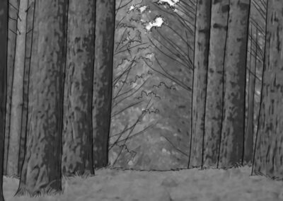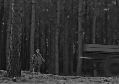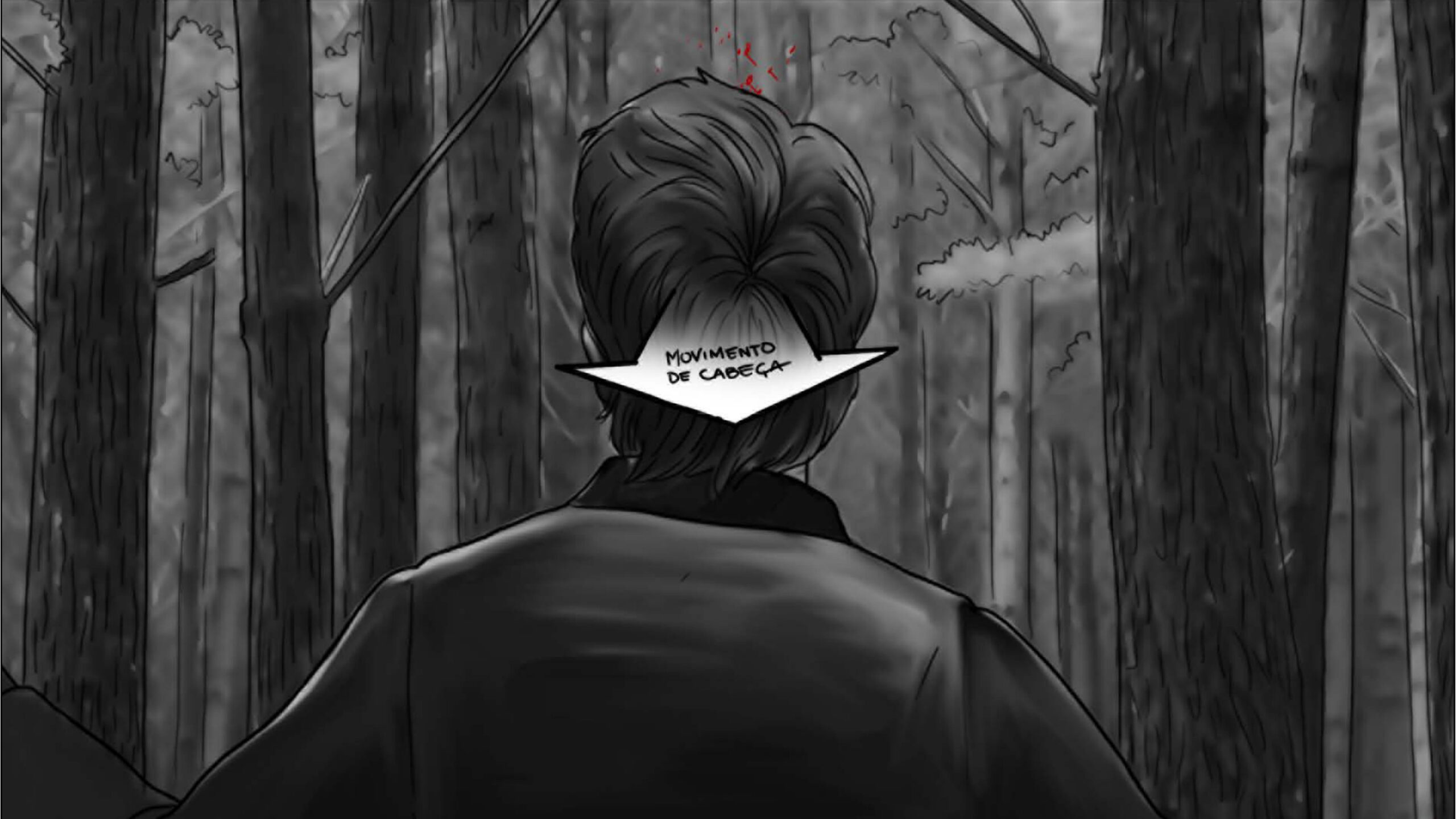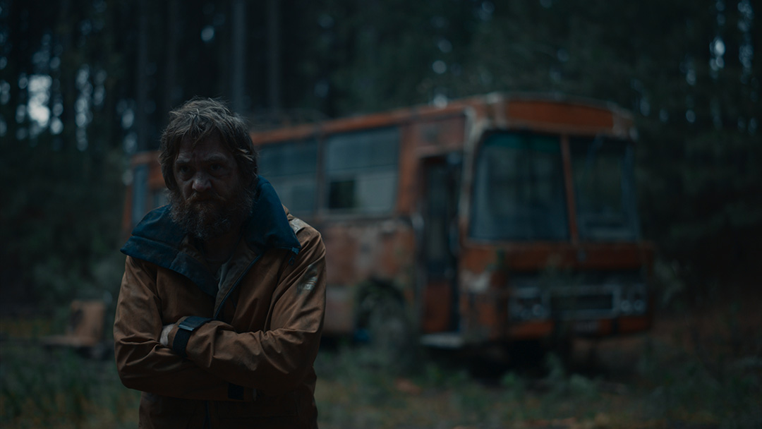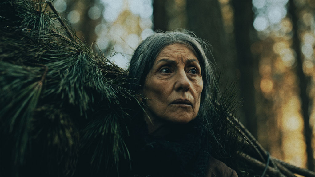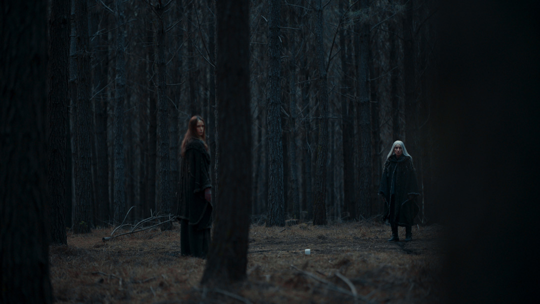 Nas externas dia, segui a mesma linha naturalista, evitando usar refletores na maioria das vezes. O chão de palha da floresta servia como rebatedor natural e muito suave, respeitando a iluminação zenital originária das árvores. Essa luz vinda de cima gerava olheiras nos personagens, o que foi assumido como linguagem. A textura e as cores da vegetação foram essenciais para transmitir a atmosfera sobrenatural. Às vezes o sol entrava entre as folhas proporcionando feixes de luz ao longo do bosque e criando profundidade.