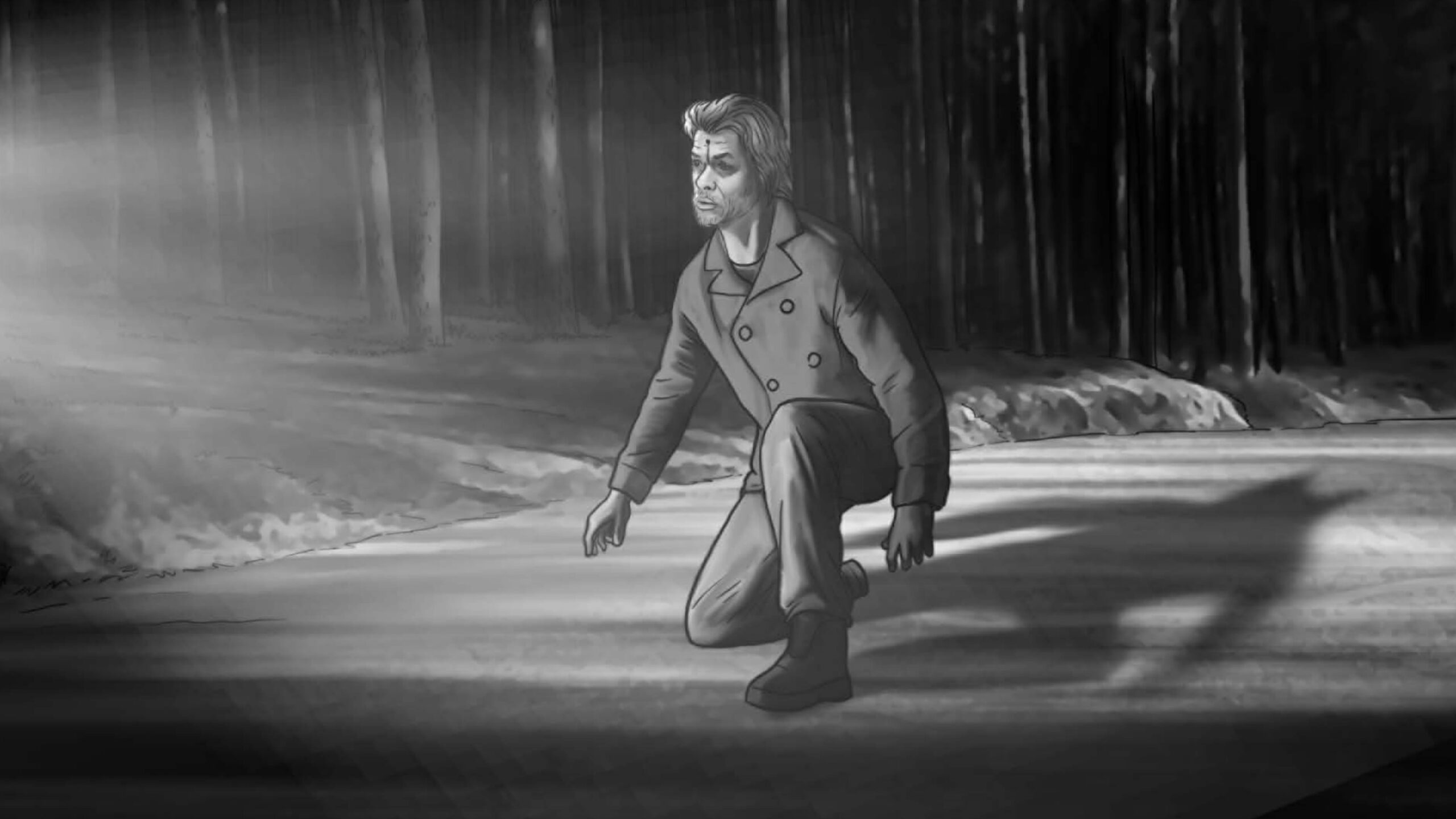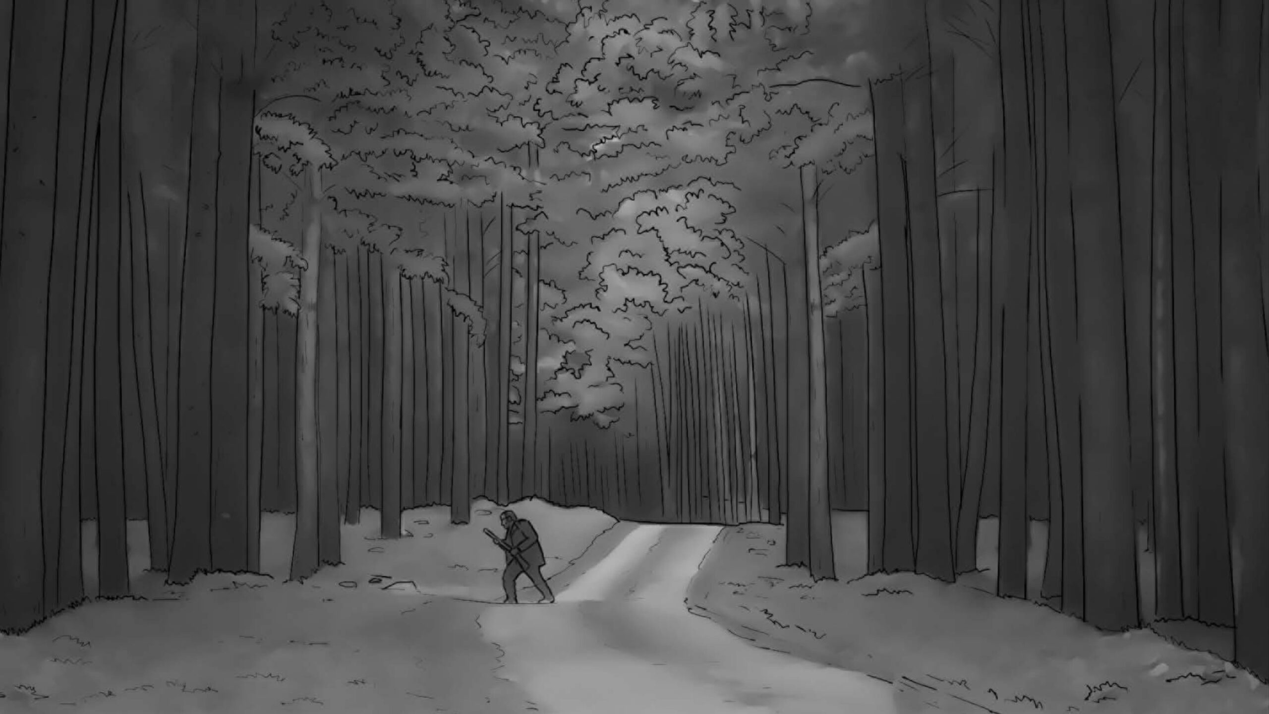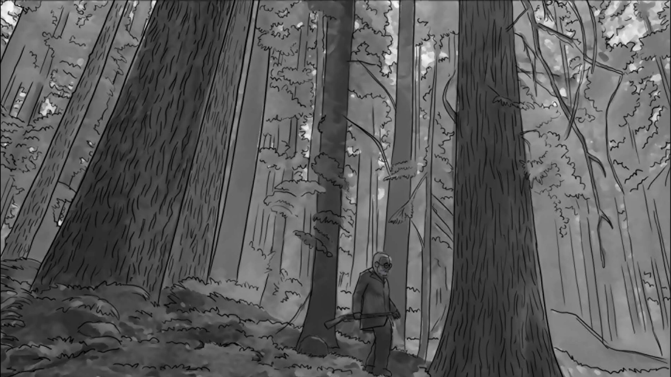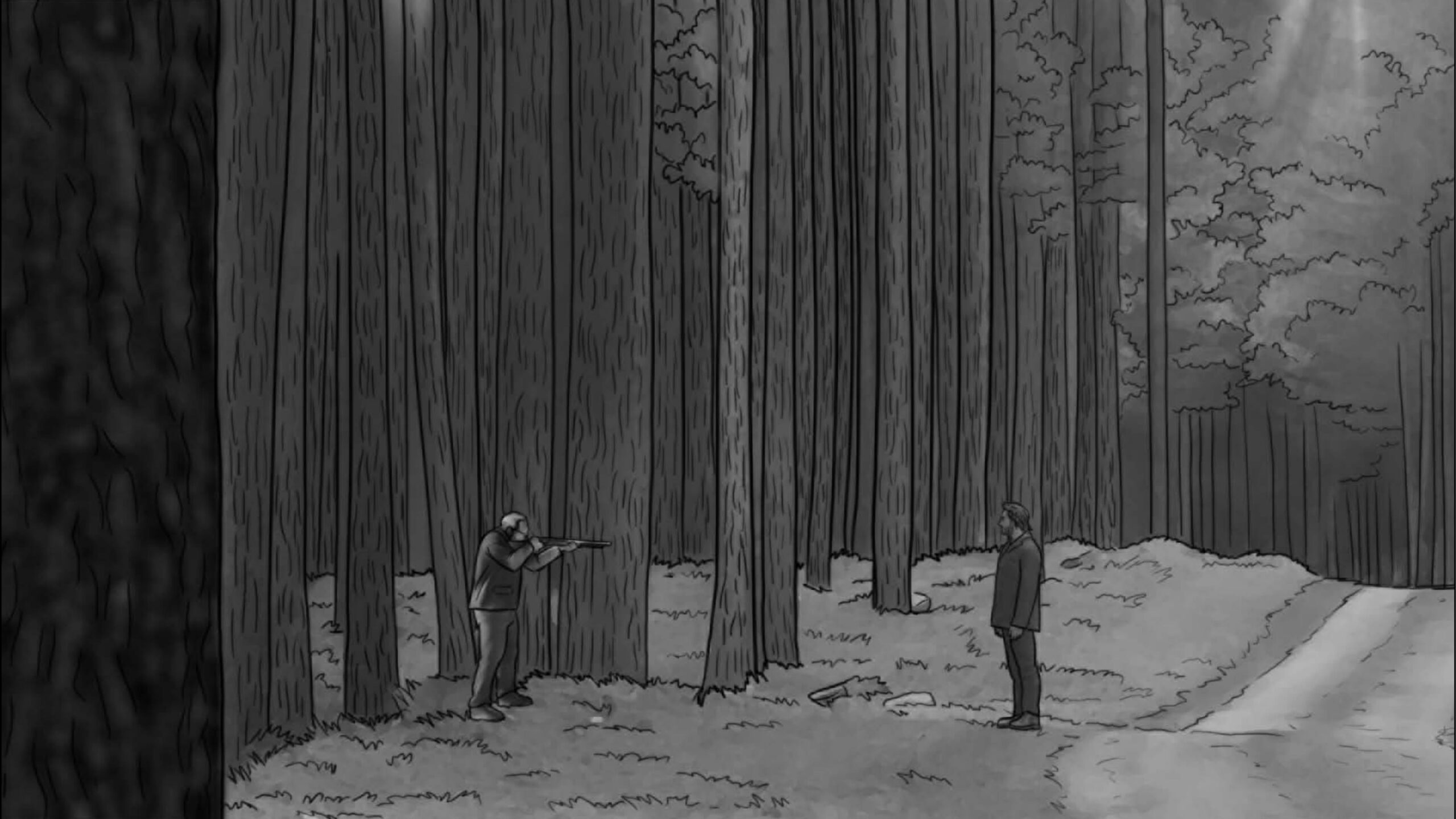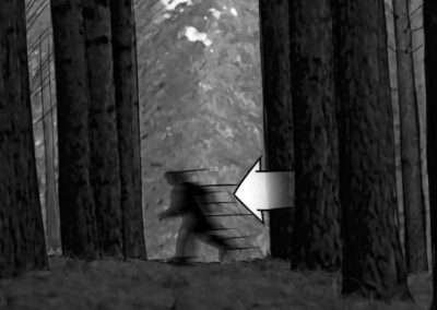 Nas externas dia, segui a mesma linha naturalista, evitando usar refletores na maioria das vezes. O chão de palha da floresta servia como rebatedor natural e muito suave, respeitando a iluminação zenital originária das árvores. Essa luz vinda de cima gerava olheiras nos personagens, o que foi assumido como linguagem. A textura e as cores da vegetação foram essenciais para transmitir a atmosfera sobrenatural. Às vezes o sol entrava entre as folhas proporcionando feixes de luz ao longo do bosque e criando profundidade.