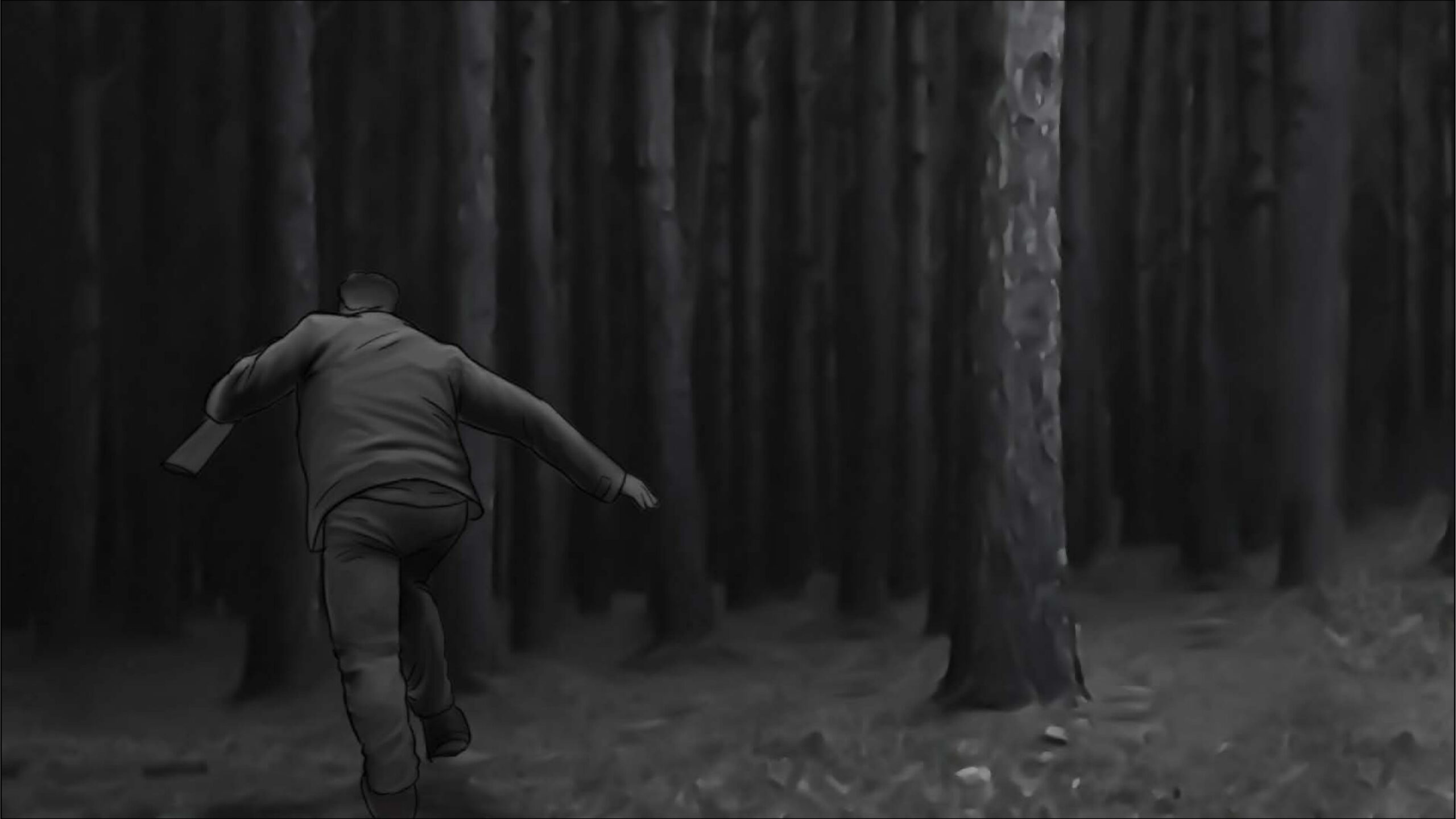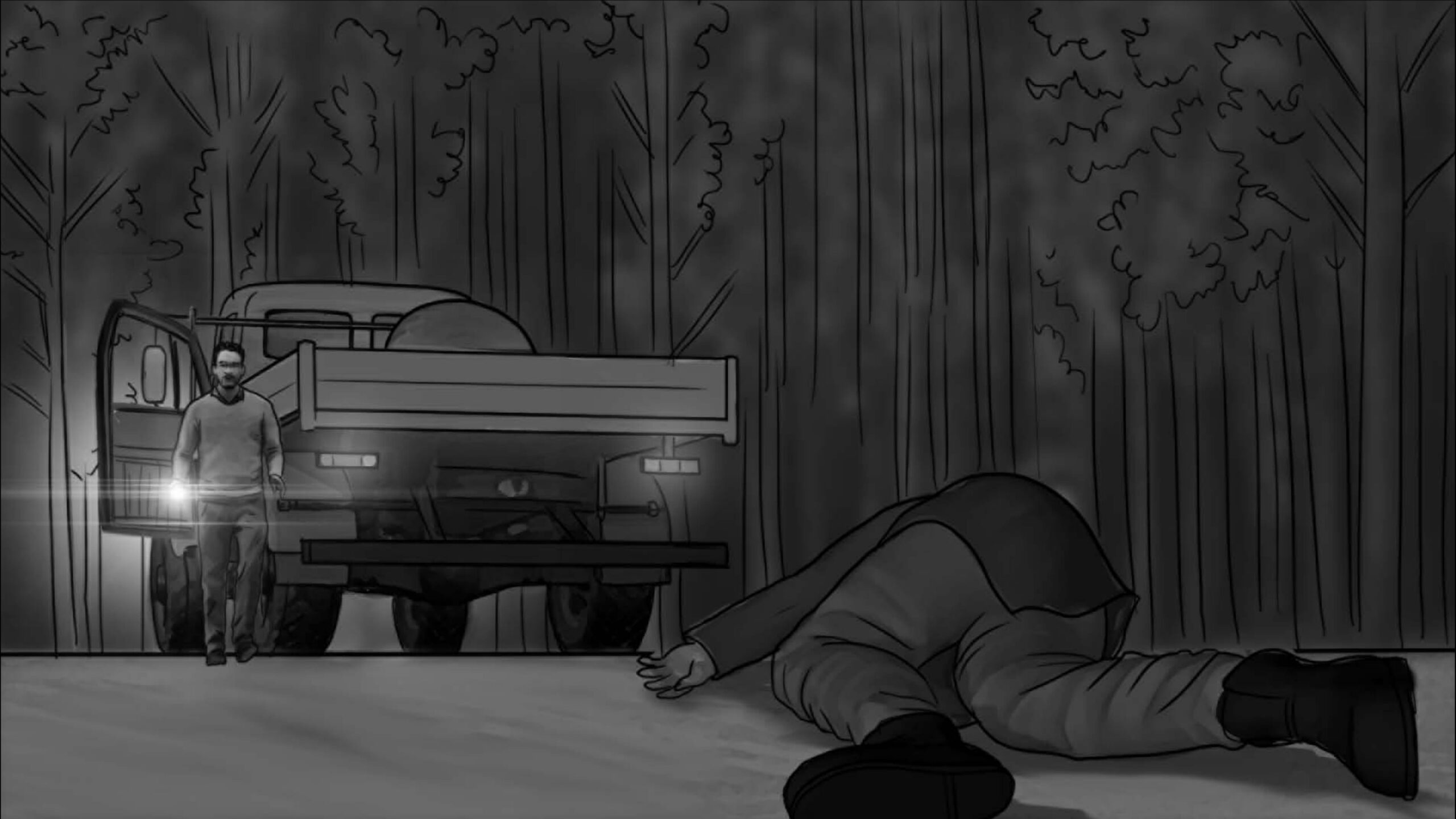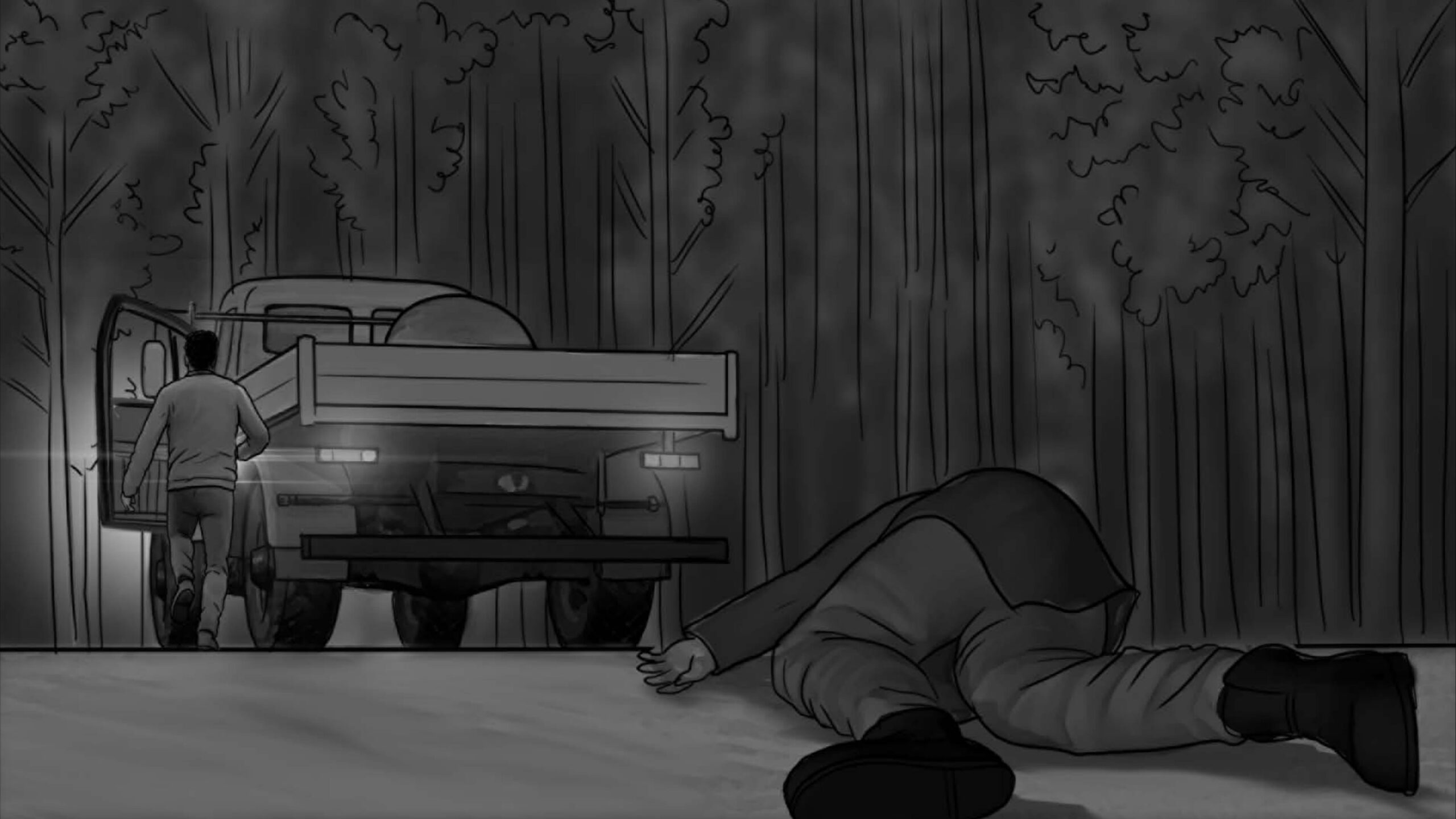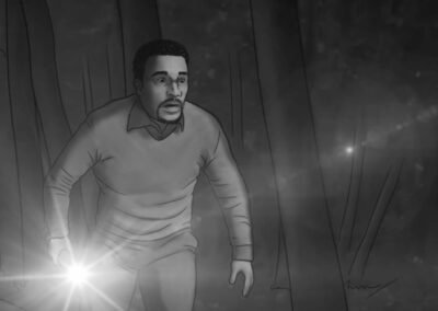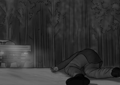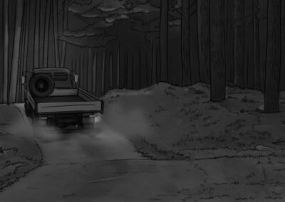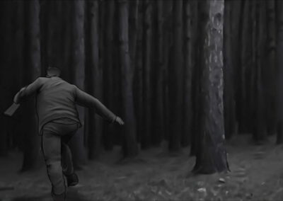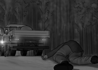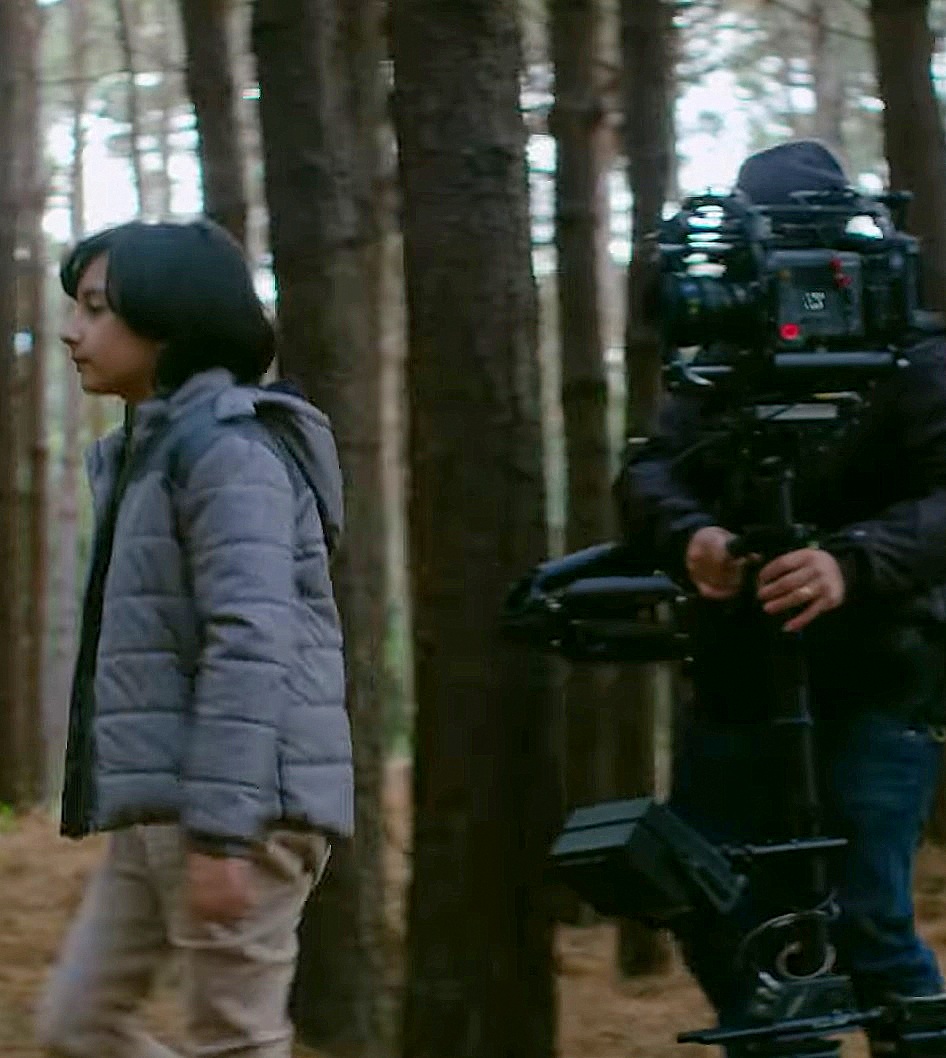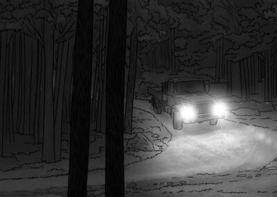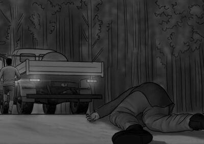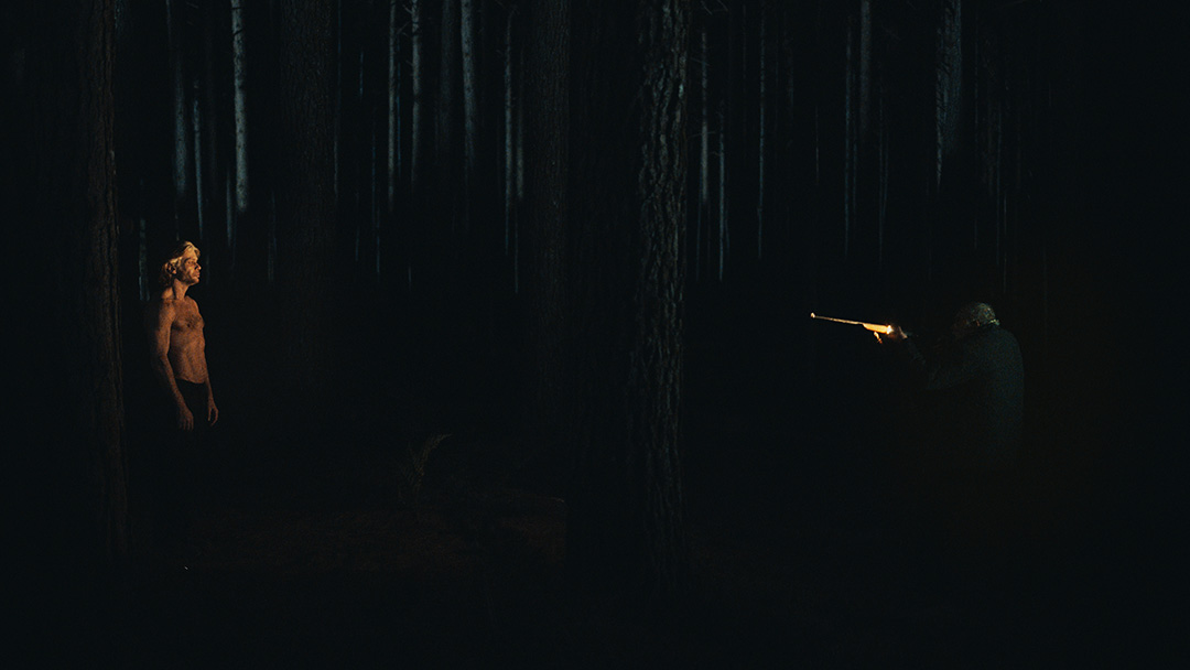 As noturnas na floresta foram um desafio. Para essas cenas, optei por iluminar o fundo com eixos opostos de luz, sempre utilizando os Goya`s do estúdio difundidos com 3010 e 3026. O objetivo era iluminar a maior área possível, usando o centro da região iluminada, fugindo dos extremos, onde estava muito claro ou muito escuro. Nos planos mais fechados que envolviam vários personagens, era possível difundir essas fontes de luz mais duras com butterflys de 4×4. Além disso, nesses planos foram utilizadas pequenas fontes, como lanternas e lâmpadas de celulares. Na floresta noturna, trabalhamos sempre com diafragma 1.5.