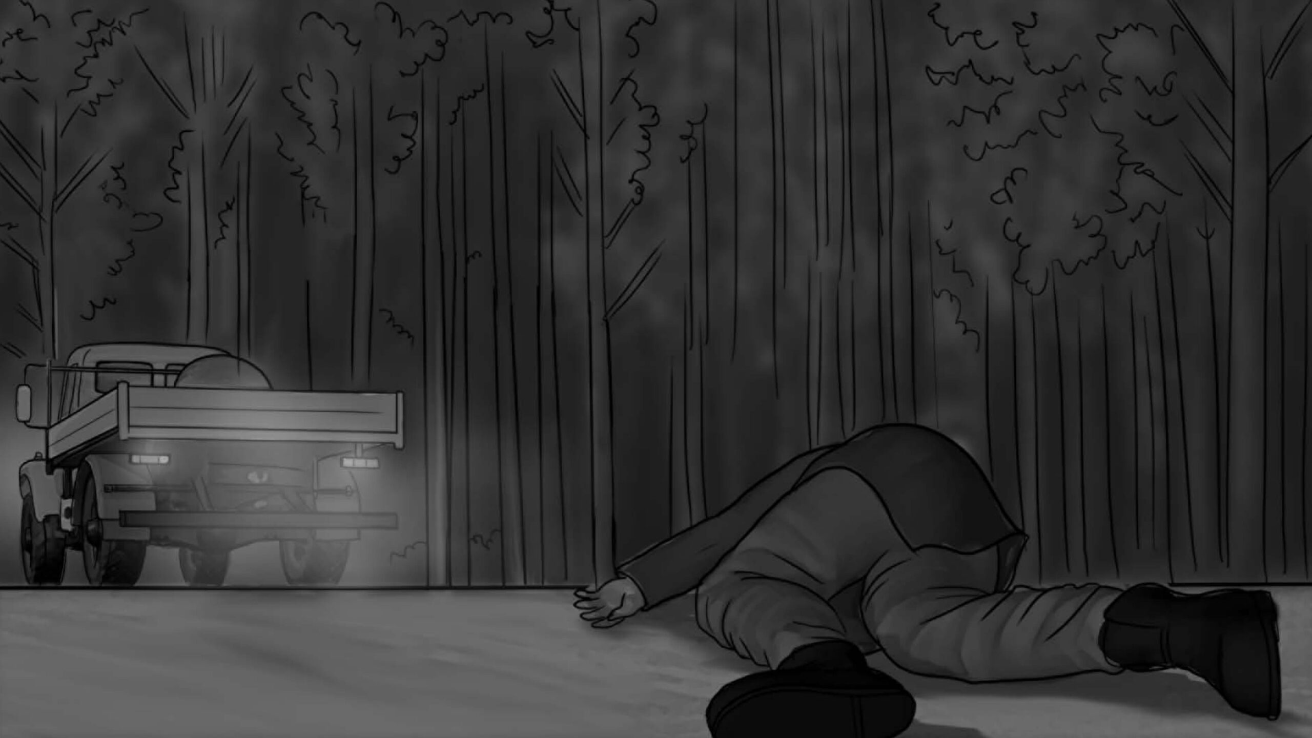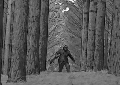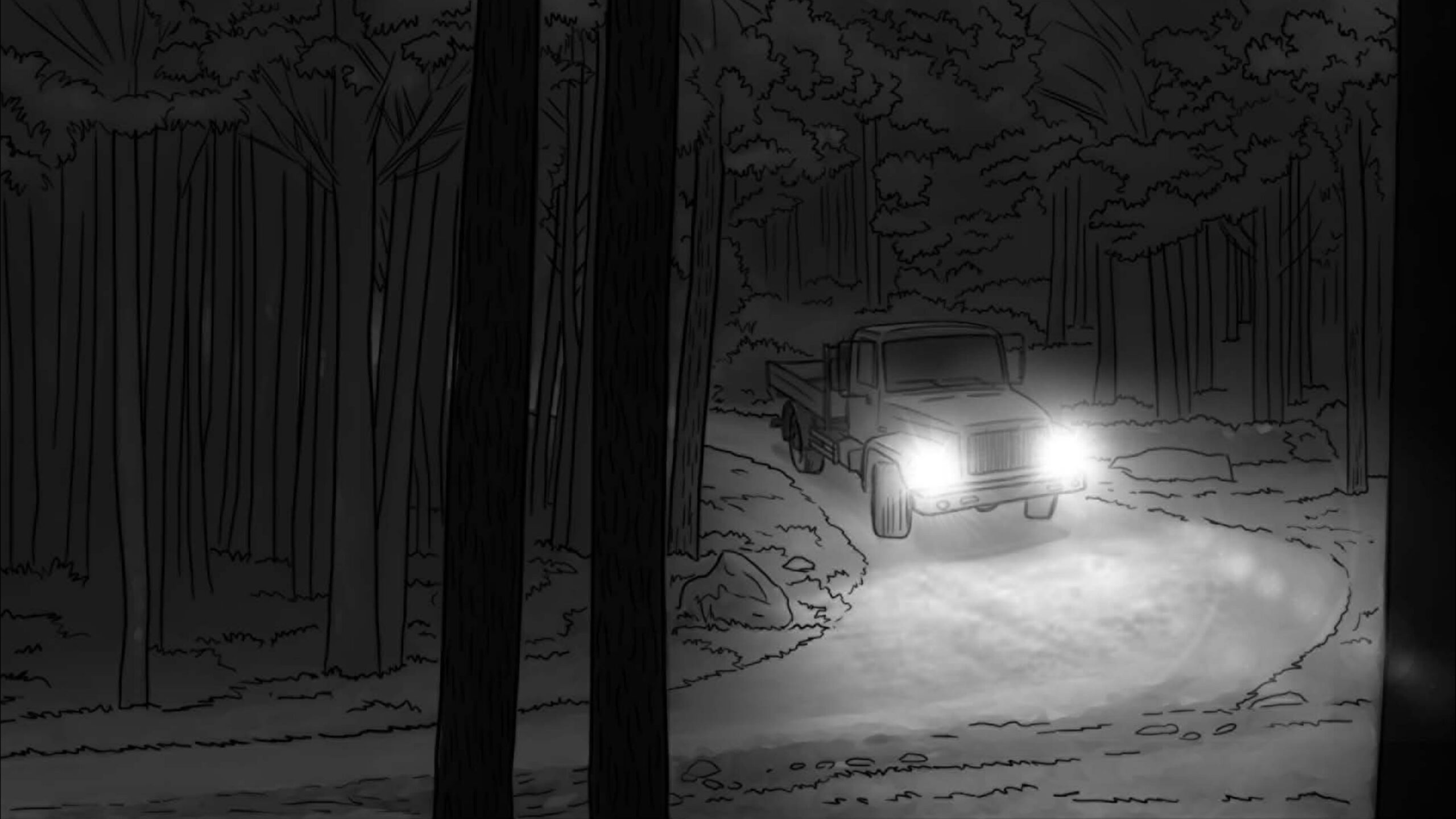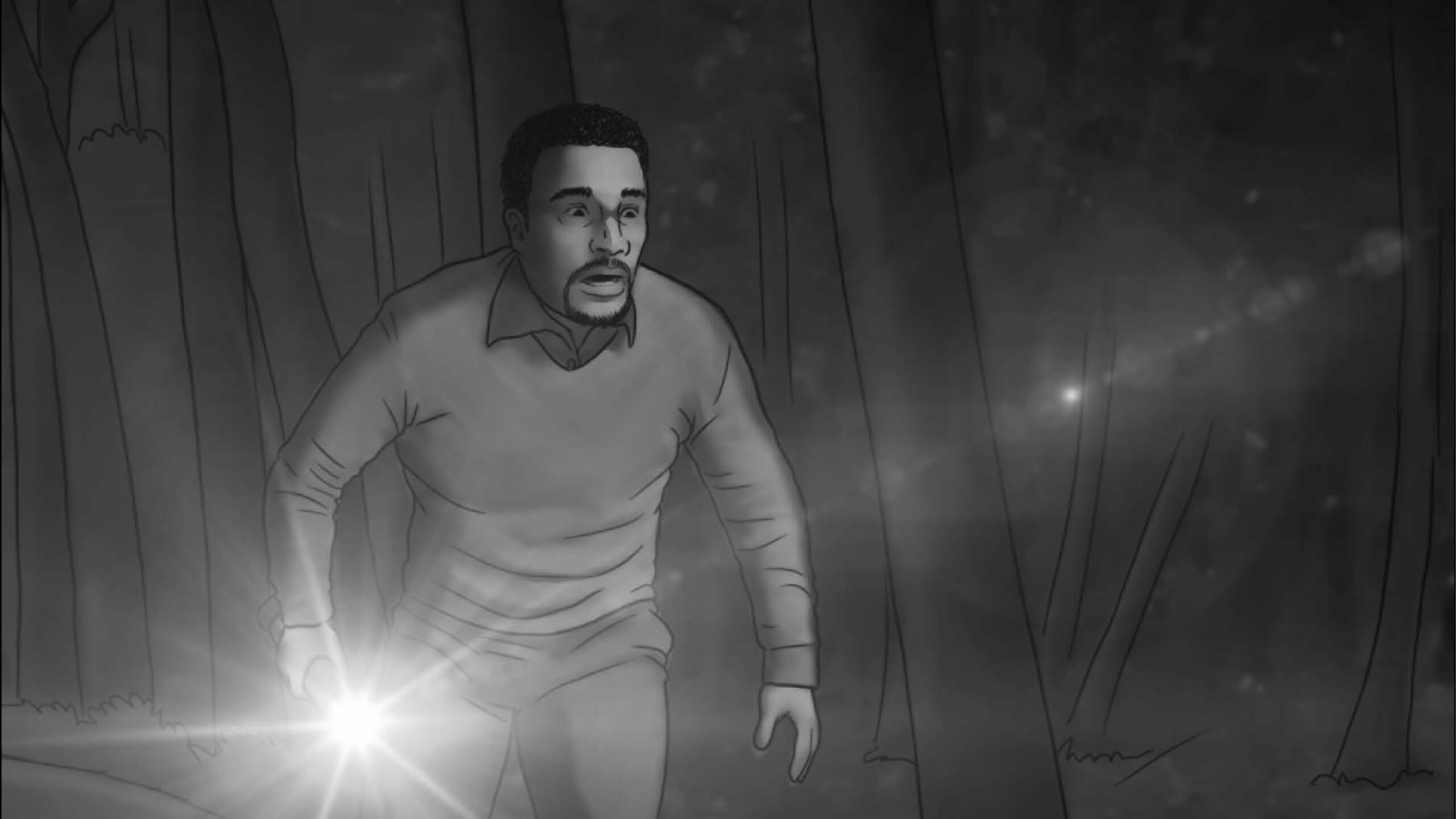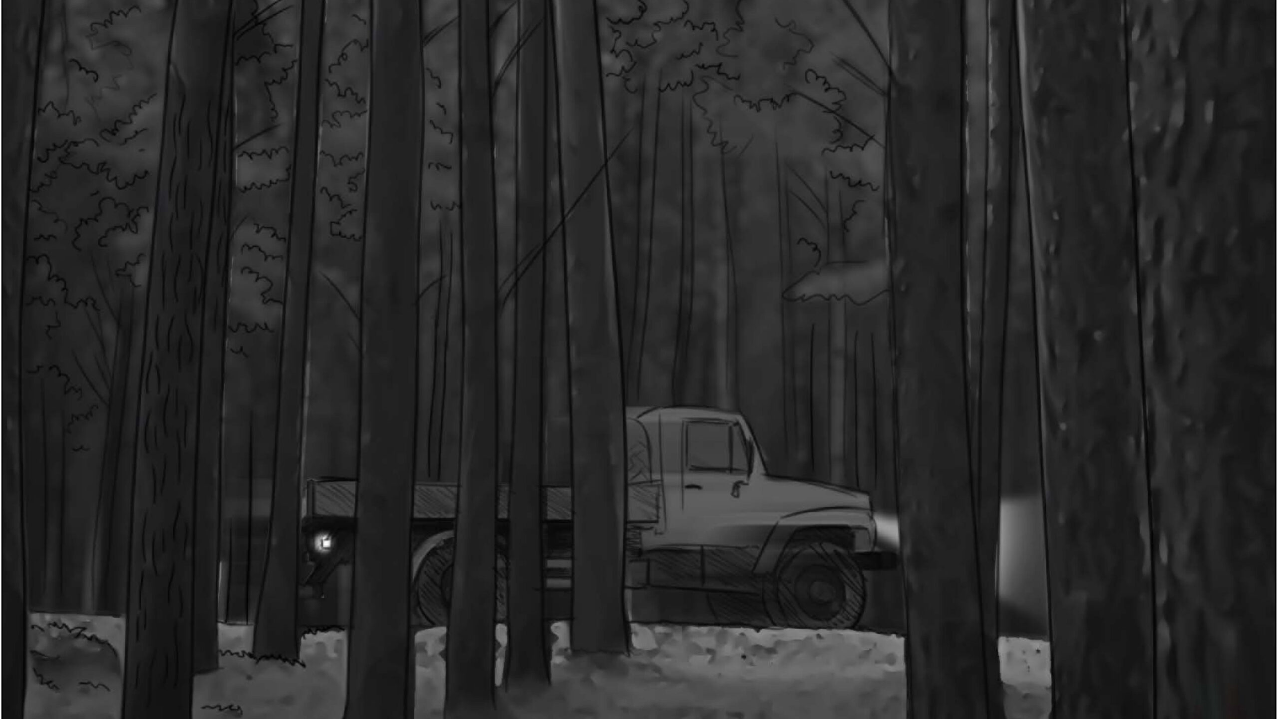 As noturnas na floresta foram um desafio. Para essas cenas, optei por iluminar o fundo com eixos opostos de luz, sempre utilizando os Goya`s do estúdio difundidos com 3010 e 3026. O objetivo era iluminar a maior área possível, usando o centro da região iluminada, fugindo dos extremos, onde estava muito claro ou muito escuro. Nos planos mais fechados que envolviam vários personagens, era possível difundir essas fontes de luz mais duras com butterflys de 4×4. Além disso, nesses planos foram utilizadas pequenas fontes, como lanternas e lâmpadas de celulares. Na floresta noturna, trabalhamos sempre com diafragma 1.5.