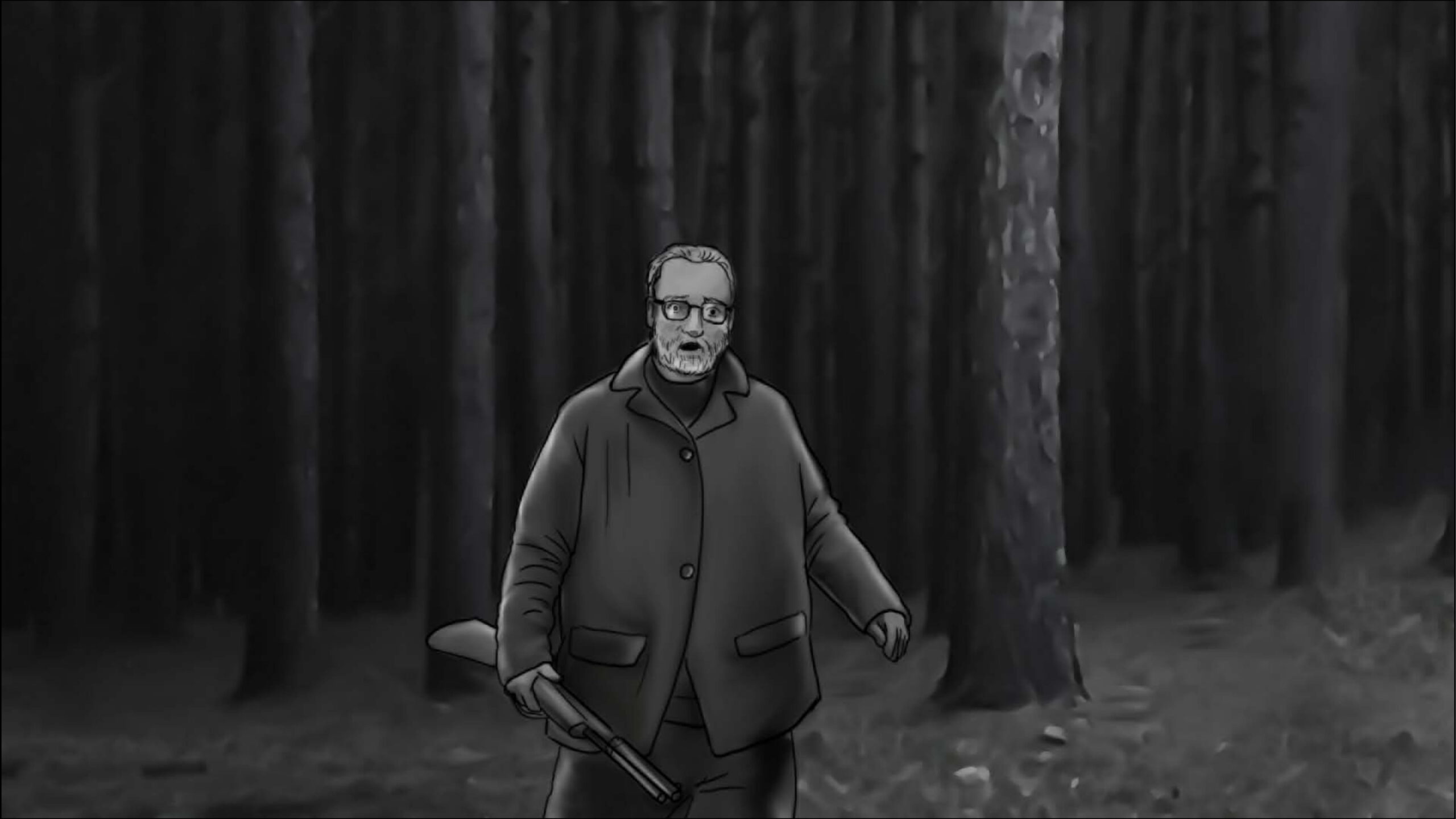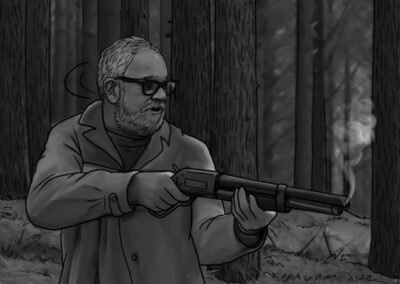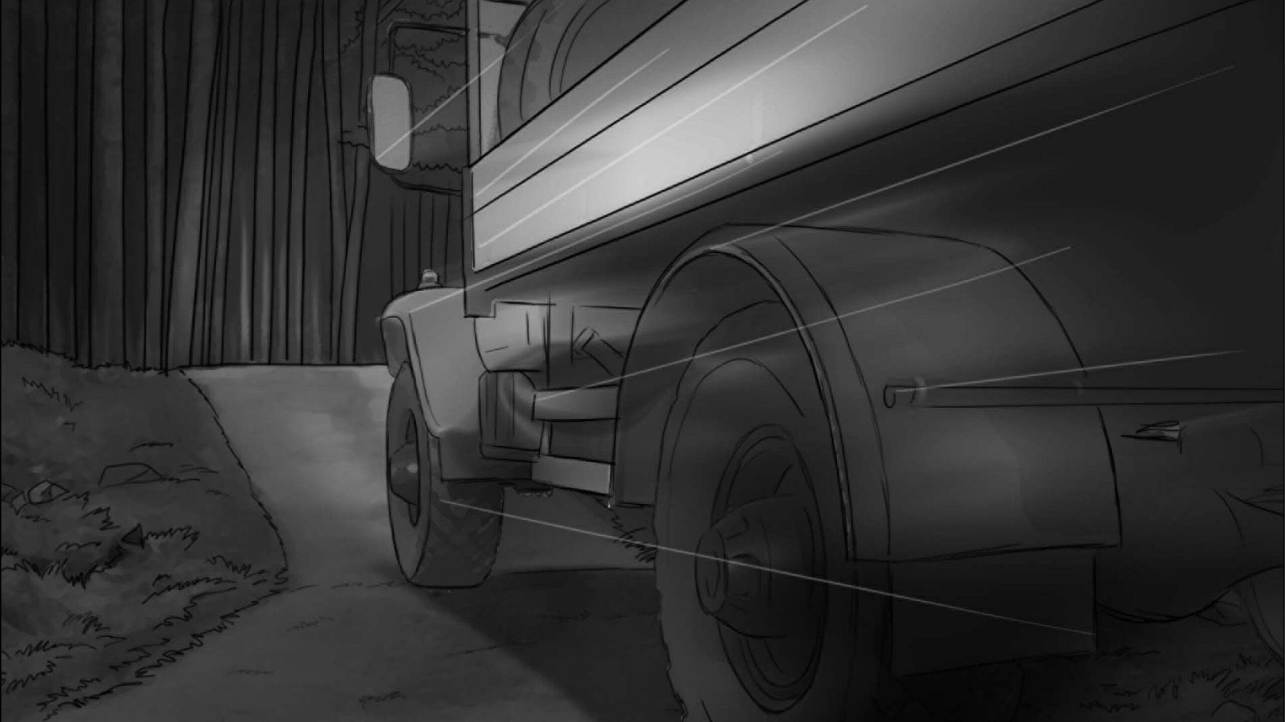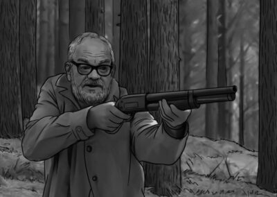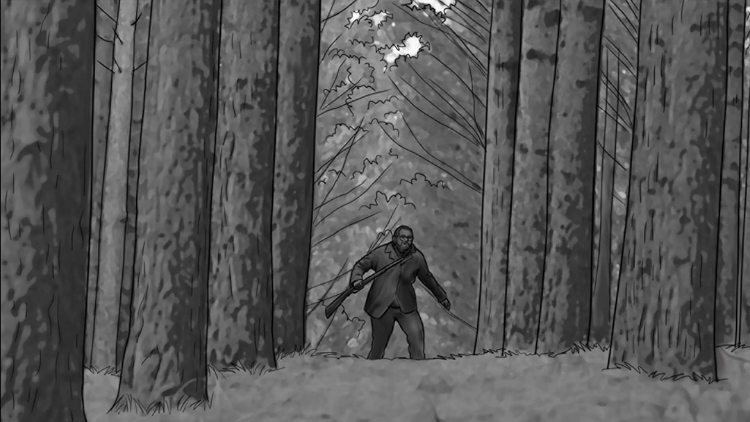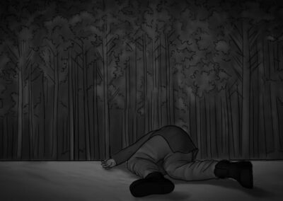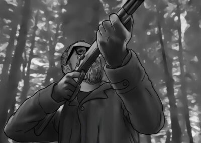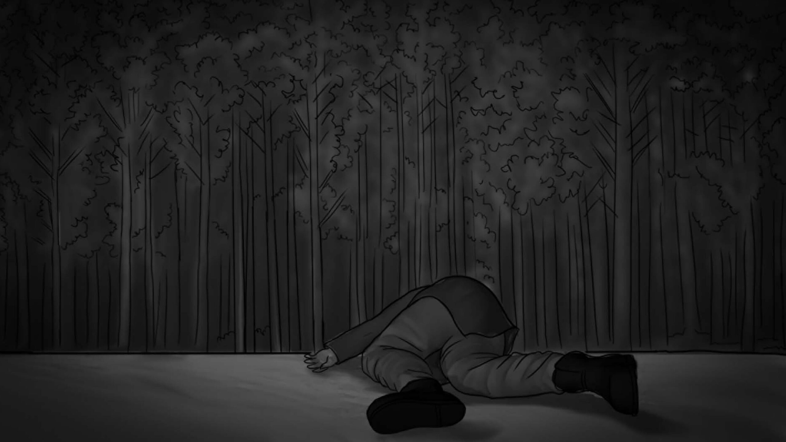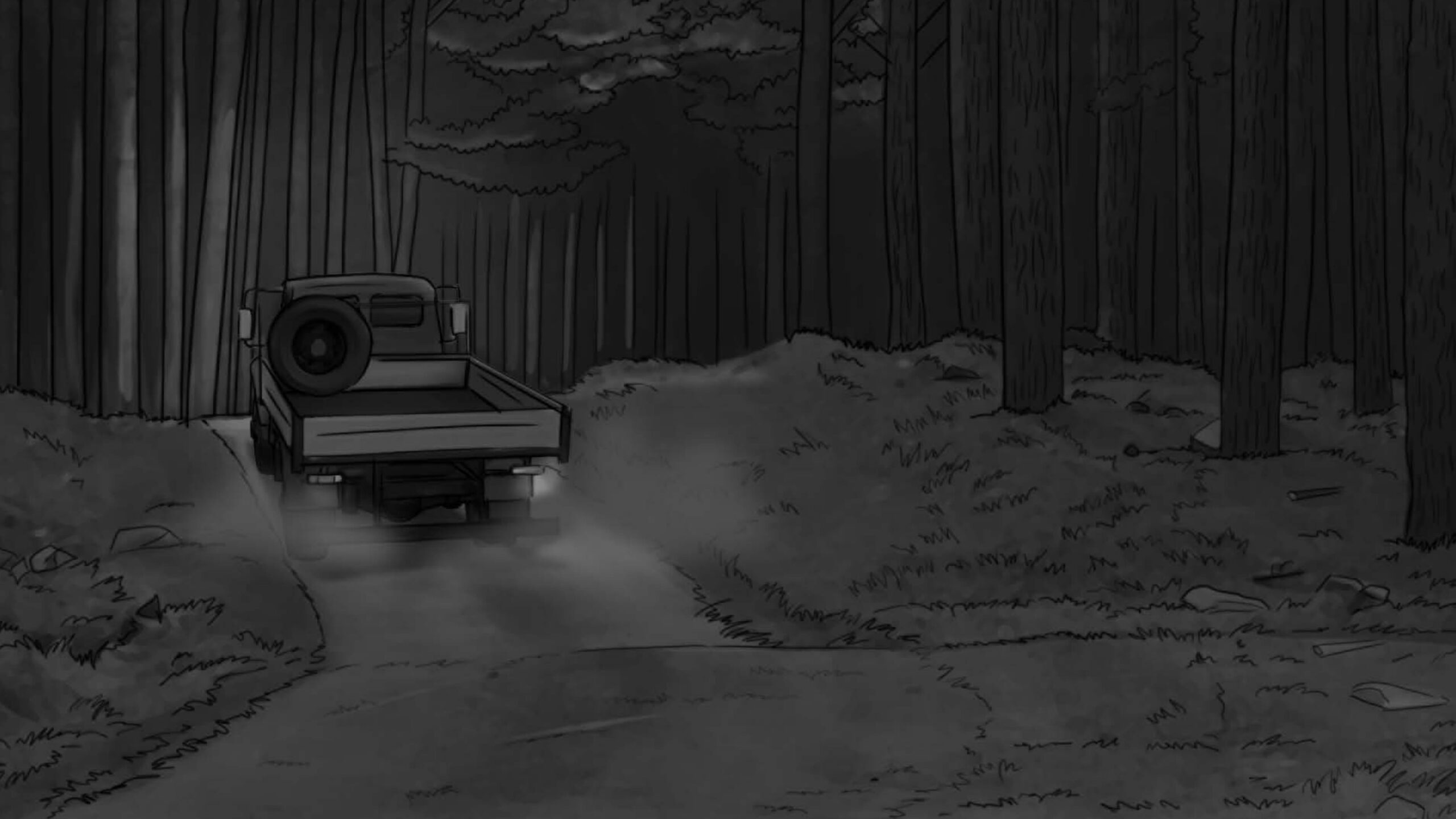 As noturnas na floresta foram um desafio. Para essas cenas, optei por iluminar o fundo com eixos opostos de luz, sempre utilizando os Goya`s do estúdio difundidos com 3010 e 3026. O objetivo era iluminar a maior área possível, usando o centro da região iluminada, fugindo dos extremos, onde estava muito claro ou muito escuro. Nos planos mais fechados que envolviam vários personagens, era possível difundir essas fontes de luz mais duras com butterflys de 4×4. Além disso, nesses planos foram utilizadas pequenas fontes, como lanternas e lâmpadas de celulares. Na floresta noturna, trabalhamos sempre com diafragma 1.5.