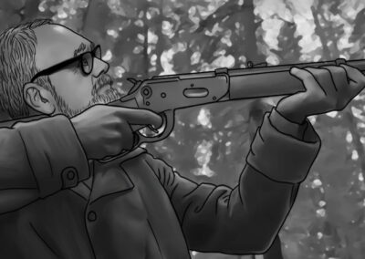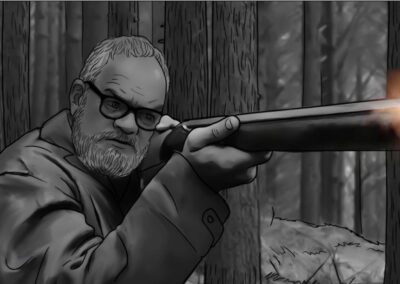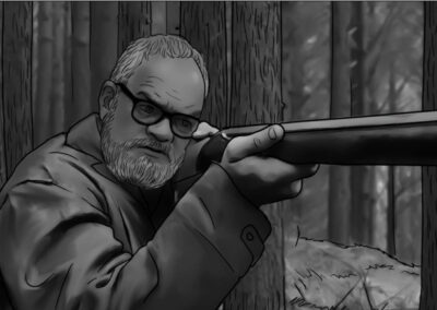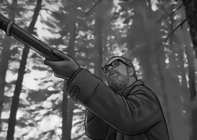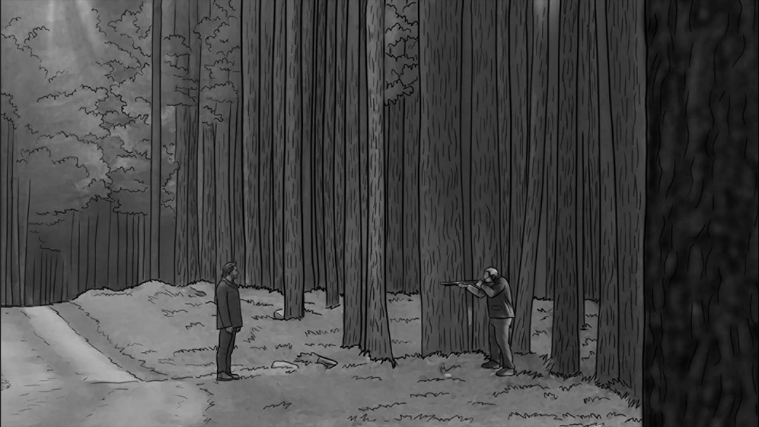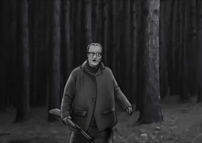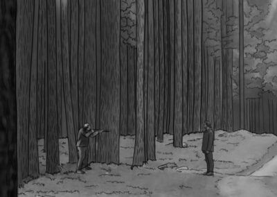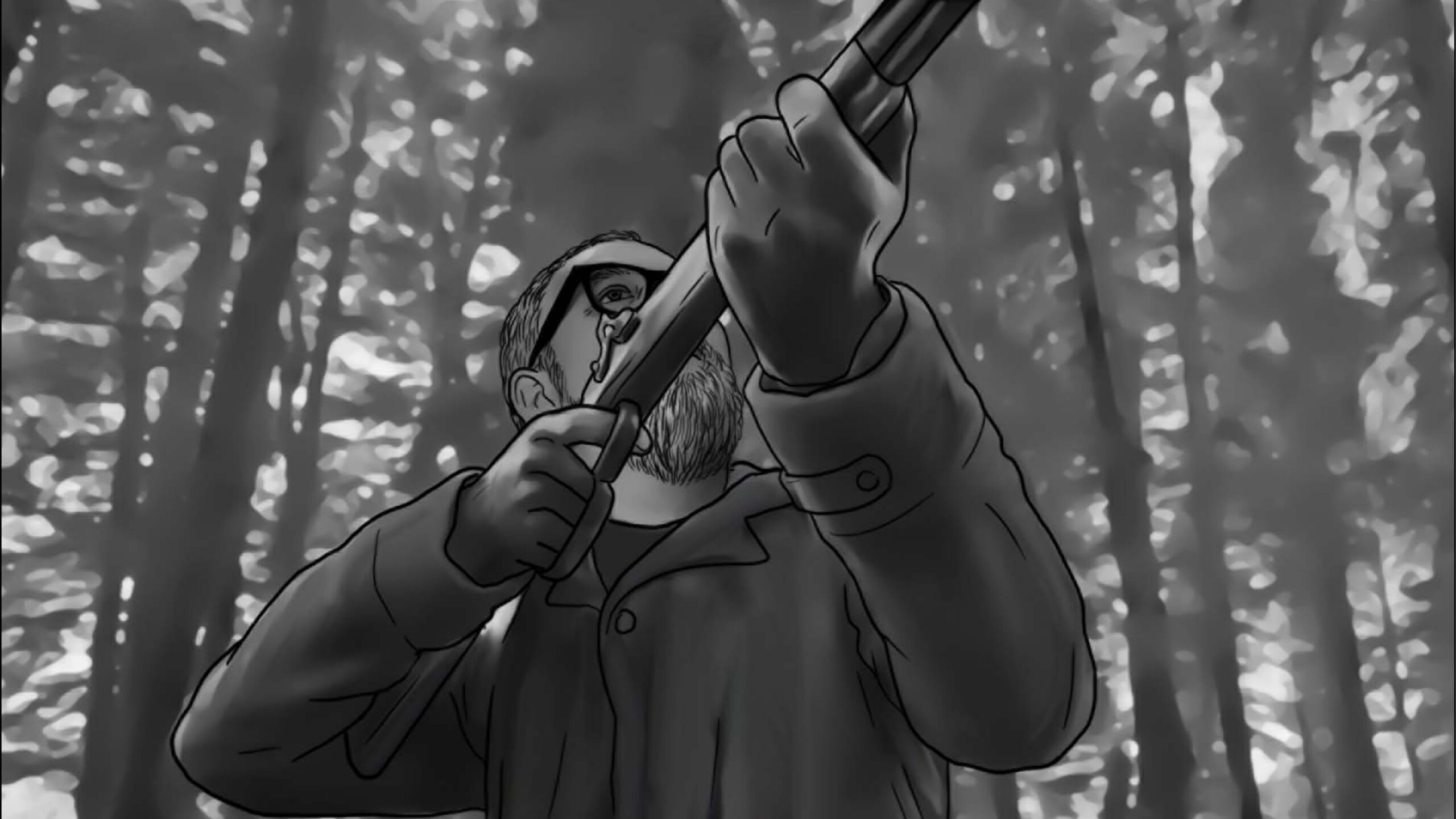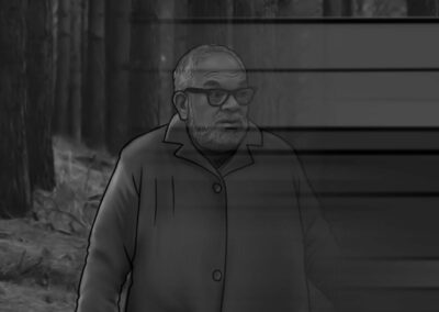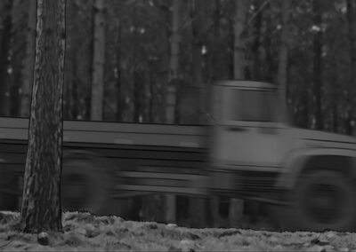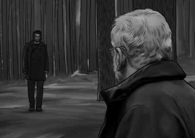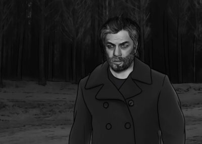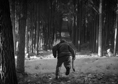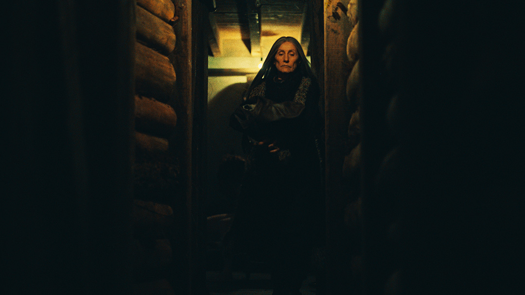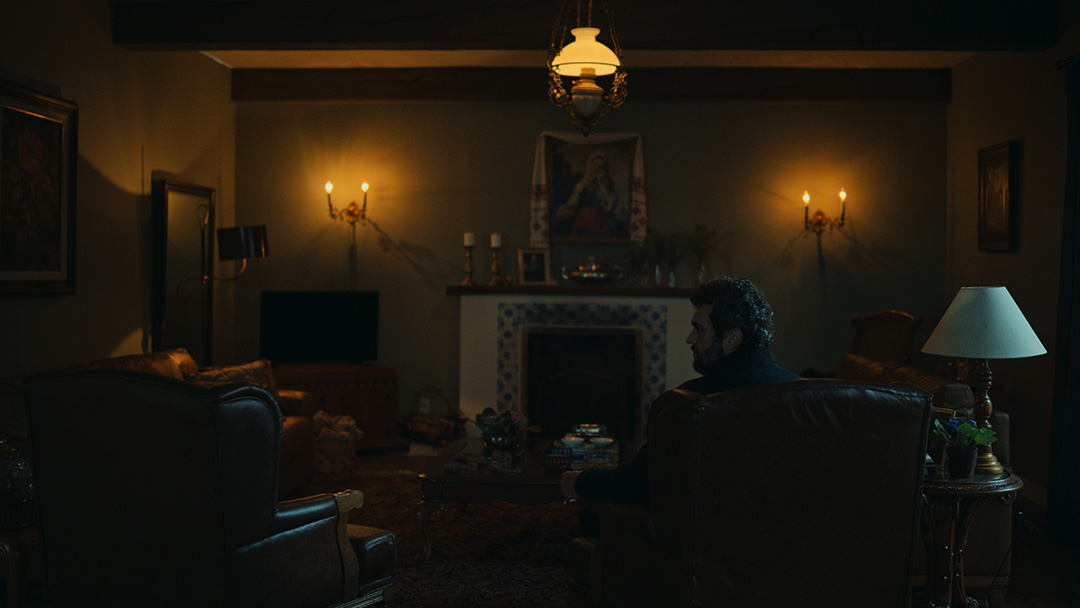 Por se tratar de uma colônia ucraniana no sul do Brasil, busquei simular nas locações uma luz do leste europeu: mais suave e com raros momentos de incidência de sol direto nos interiores. Muitas vezes, foi mais sobre onde retirar luz do que onde adicionar. O pano preto foi utilizado muitas vezes com o intuito de negativar as cenas. Esse pensamento cinematográfico foi praticado tanto nas locações quanto nos estúdios.